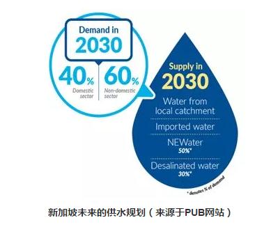 也在同一年,受到NEWater示范項目成功的鼓舞,PUB提出重新制定新加坡的供水水質規劃——“四個國家水龍頭”計劃,計劃到2060年,即與馬拉西亞供水協議到期前一年,新加坡將完全實現水資源的自給自足,在新加坡的總人口已達到目前的3倍的前提下,海水淡化和NEWater能夠滿足水資源需求量的80%,其中NEWater占55%。